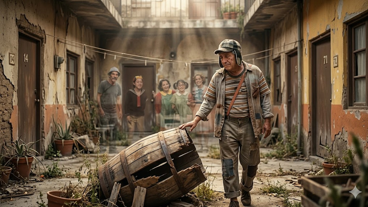 El Chavo del 8 se detiene frente a unas tablas podridas. Ahí estaba el barril. Entonces la IA mezcla recuerdos originales del programa: Kiko ríe, la Chilindrina hace una travesura, Don Ramón da un coscorrón. Pero al volver al presente, solo hay silencio y polvo.
