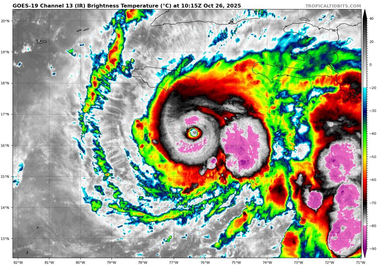 El fenómeno se ubica a 195 km al sur/sureste de Kingston, Jamaica, avanzando al oeste a 7 km/h, con vientos huracanados que se extienden 35 km desde su ojo y de tormenta hasta 280 km.