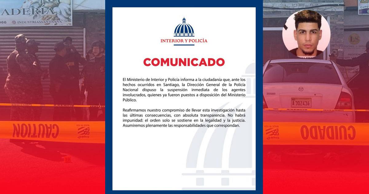 El Ministerio de Interior y Policía anunció la suspensión inmediata de los policías involucrados en los hechos de Santiago. La institución entregó a los agentes al Ministerio Público para su investigación formal.