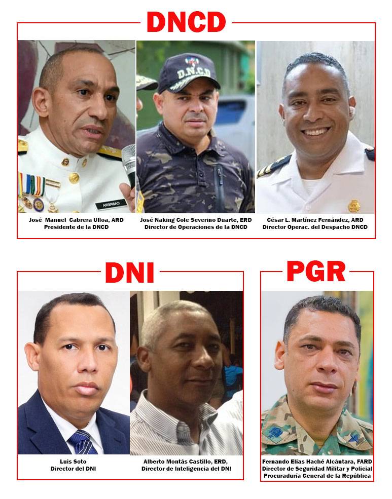 También a José Naking Cole Severino Duarte, coronel ERD y director de Operaciones de la DNCD; César Lowesqui Martínez Fernández, capitán de fragata ARD y director Operacional del Despacho de la DNCD; y Fernando Elías Haché Alcántara, general de brigada FARD y director de Seguridad Militar y Policial de la Procuraduría General de la República.